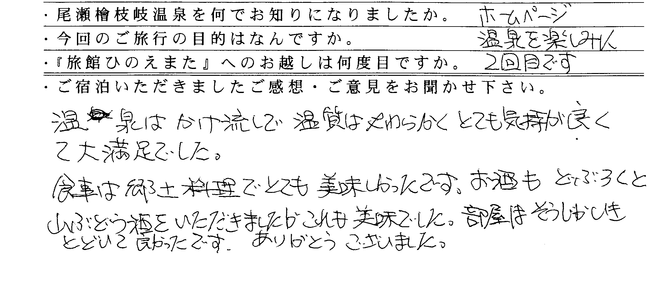 埼玉県 I様 2名ご宿泊 2026年3月2日